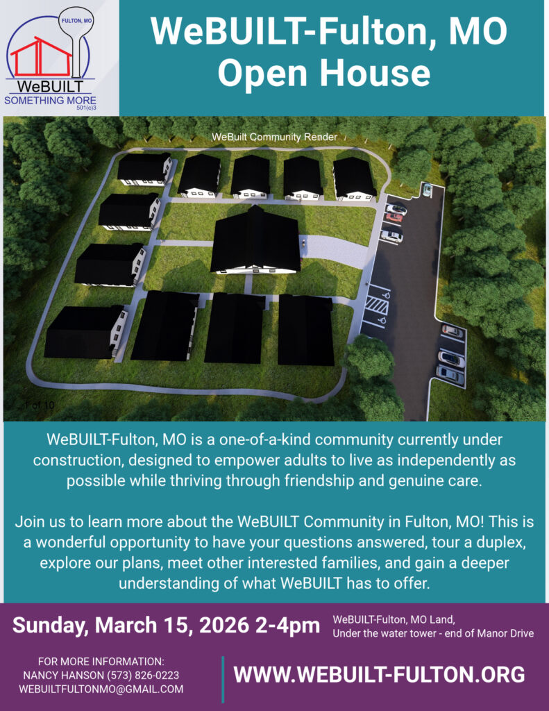 Donations are welcome by check, please send to 500 Market Place Suite 201 Fulton MO 65251, made out to WeBuilt Something more!